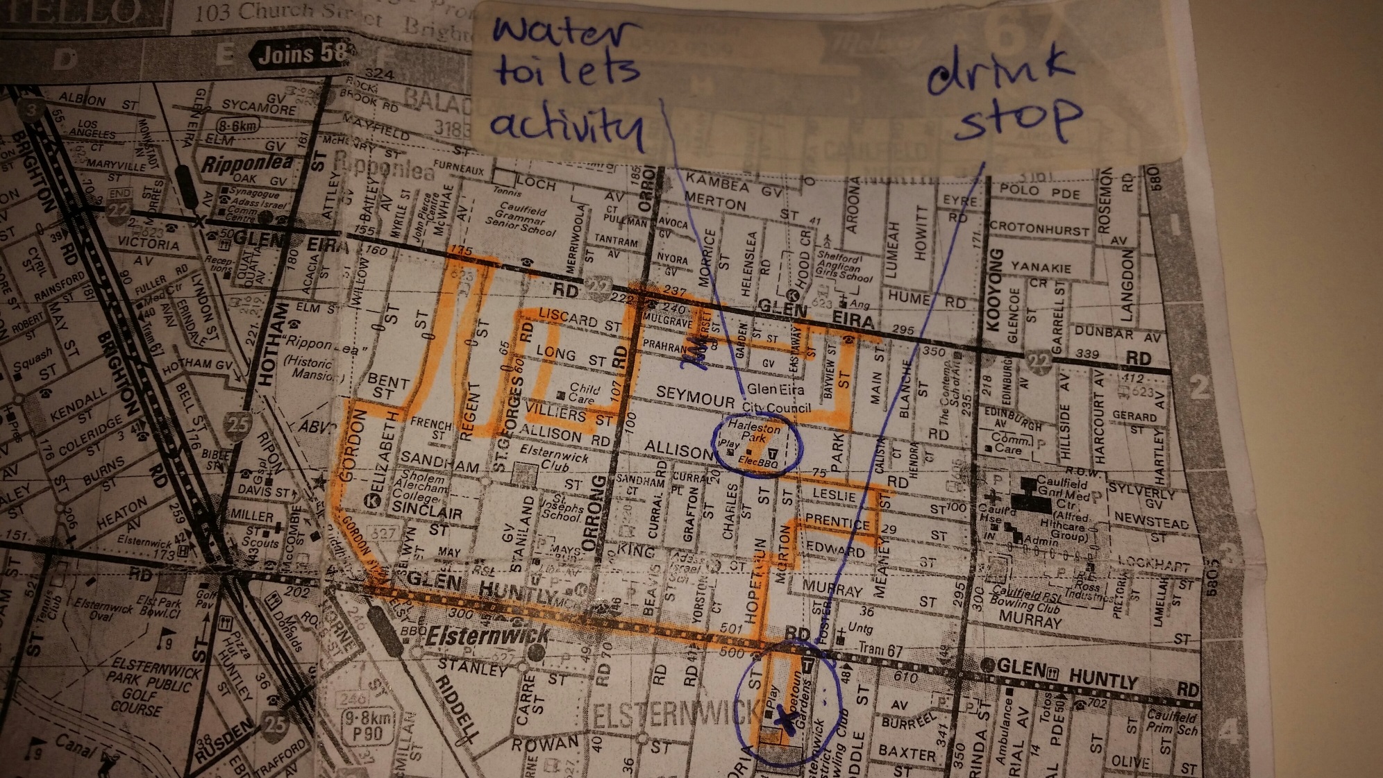 It was a tricky Run; it was the Run of the Long Back; it was the Run of the Long Check, where it took ages of running around everywhere and searching for trail. Let Me Look lived up to her name and we looked for trail everywhere and as always we eventually found it. A great part of the run was the Drink Stop and then it was an easy stroll On Home down Glenhuntly Road.